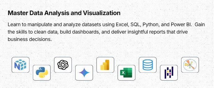 - I’m new to data analytics—can I keep up? Yes, the course is designed for absolute beginners. It starts from the fundamentals and gradually builds up your skills, much like learning to drive. You’ll begin with no prior knowledge and progress toward confidently navigating real-world data challenges. The curriculum covers the basics of data analytics, introduces tools like Excel, SQL, and Tableau, and helps you develop critical thinking to solve practical problems. You’ll also work on hands-on projects to build your portfolio and gain experience.