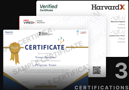 Complete the program and earn 3 industry-recognized certificates from Hero Vired, HarvardX, and FutureSkills Prime. Perfect for boosting your resume, LinkedIn profile, or job applications.